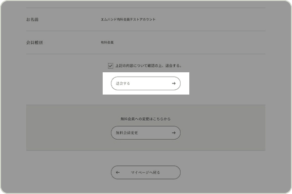 ログイン後、「マイページ」から「会員情報変更」へすすみ、「無料会員変更」をクリックして手続きを完了してください。 -