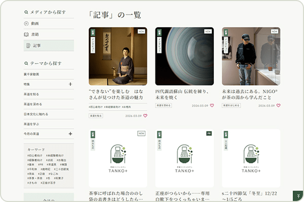 日本の総合文化である茶道は、実に多層的な要素で構成されています。TANKO+では、そんな茶道の世界を身近に感じていただけるよう、“コンシェルジュ”として季節やテーマに沿った多彩な切り口で情報をご提案します。