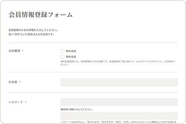 「お名前」や「パスワード」などの登録が完了すると、無料会員登録が完了します。
