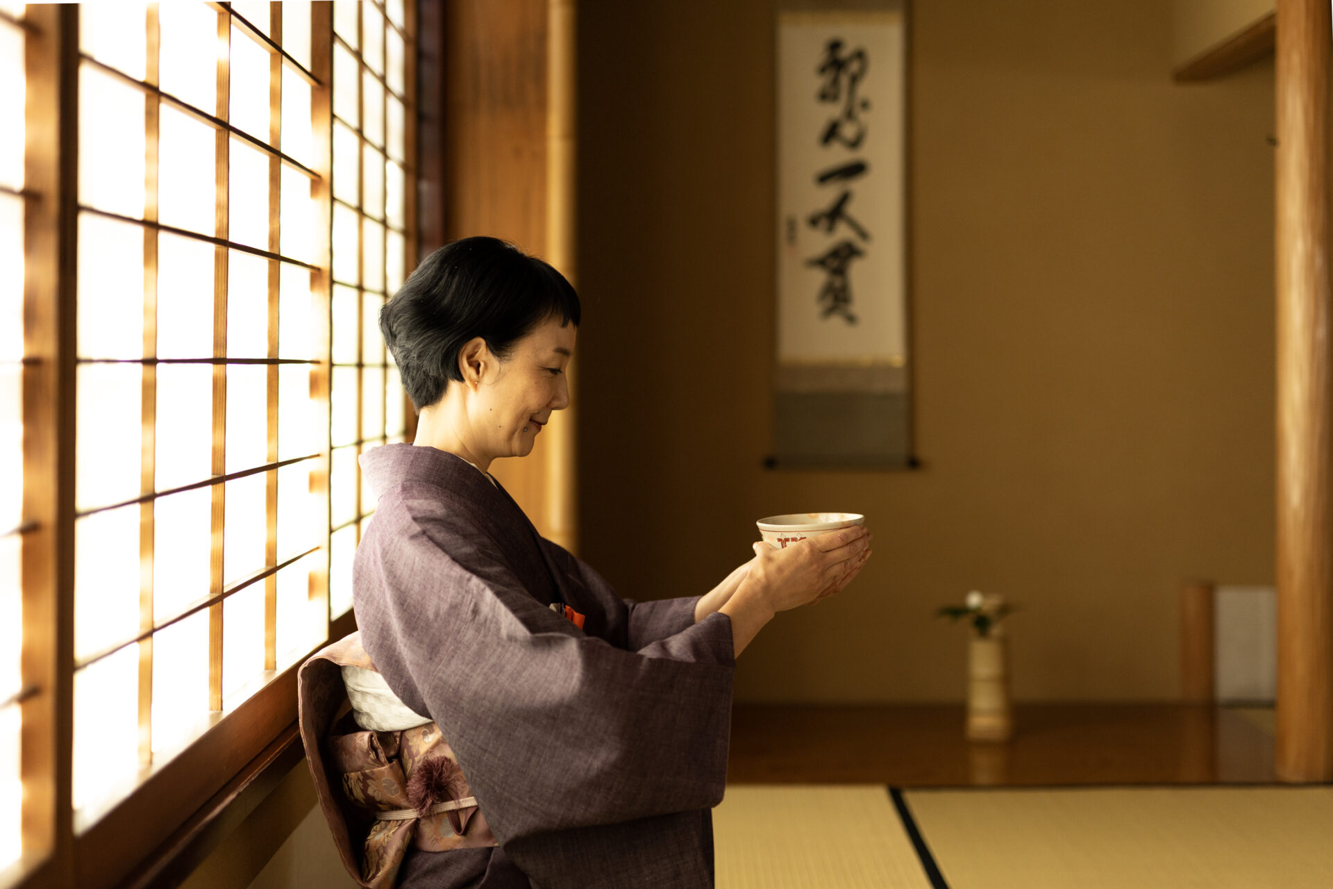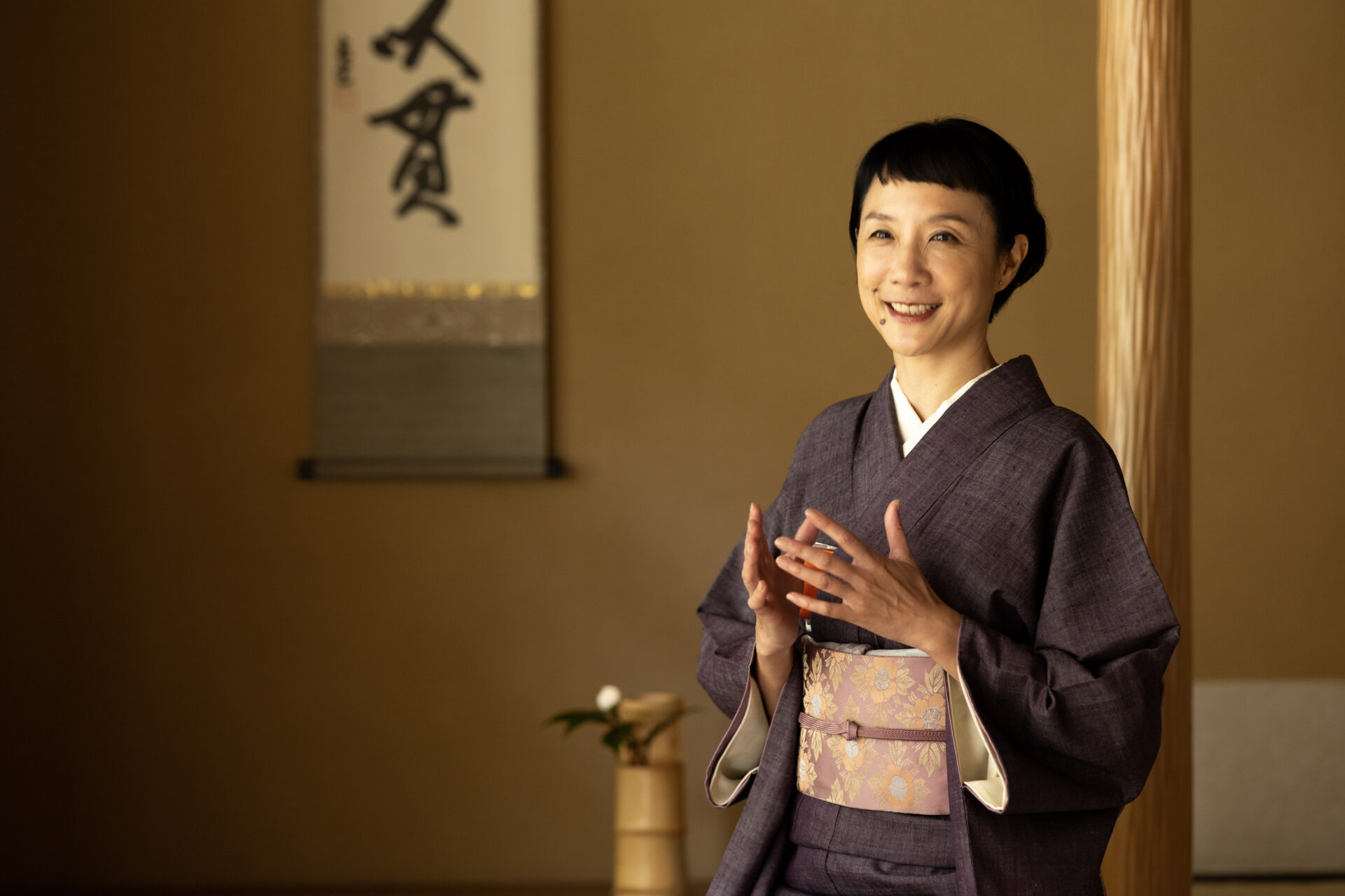 は: すごく変わりました。モデルの仕事柄、姿勢は意識していましたが、お稽古を始めてからは、姿勢はもちろんのこと、指先まで意識するようになりました。あと、旅先お旅館などでのちょっとしたお辞儀とか、お茶の飲み方とかも以前よりも美しくできるようになったかもしれません。着物を着ると自然と姿勢がよくなりますし、体幹も鍛えられる。家に帰るとちょっと雑に扱っちゃうけど(笑)、お茶の稽古場では、自分の心身を整える時間を持てています。