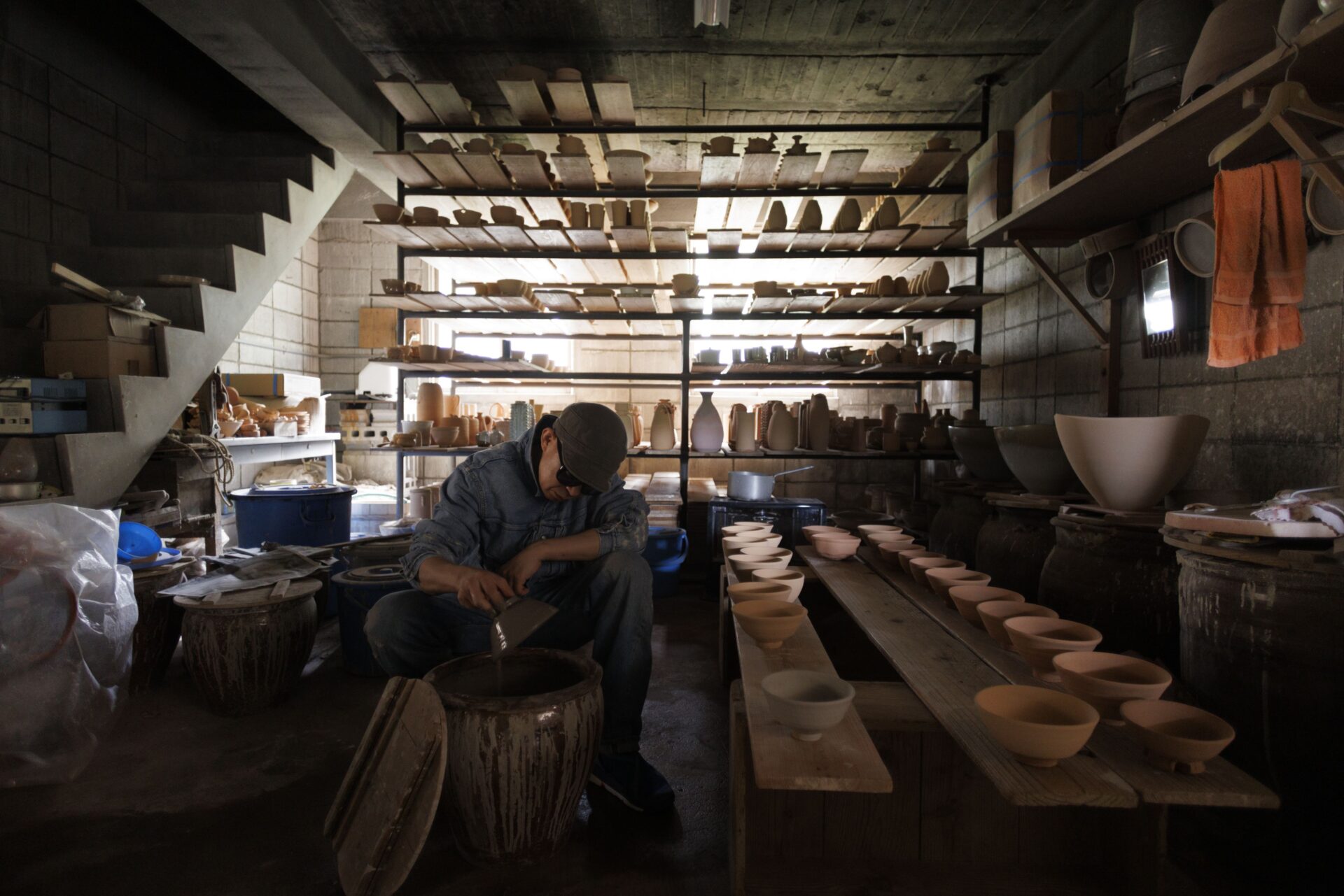 山口県長門市の田原陶兵衛工房にて。一碗、一碗、丁寧に釉薬を掛けていく。