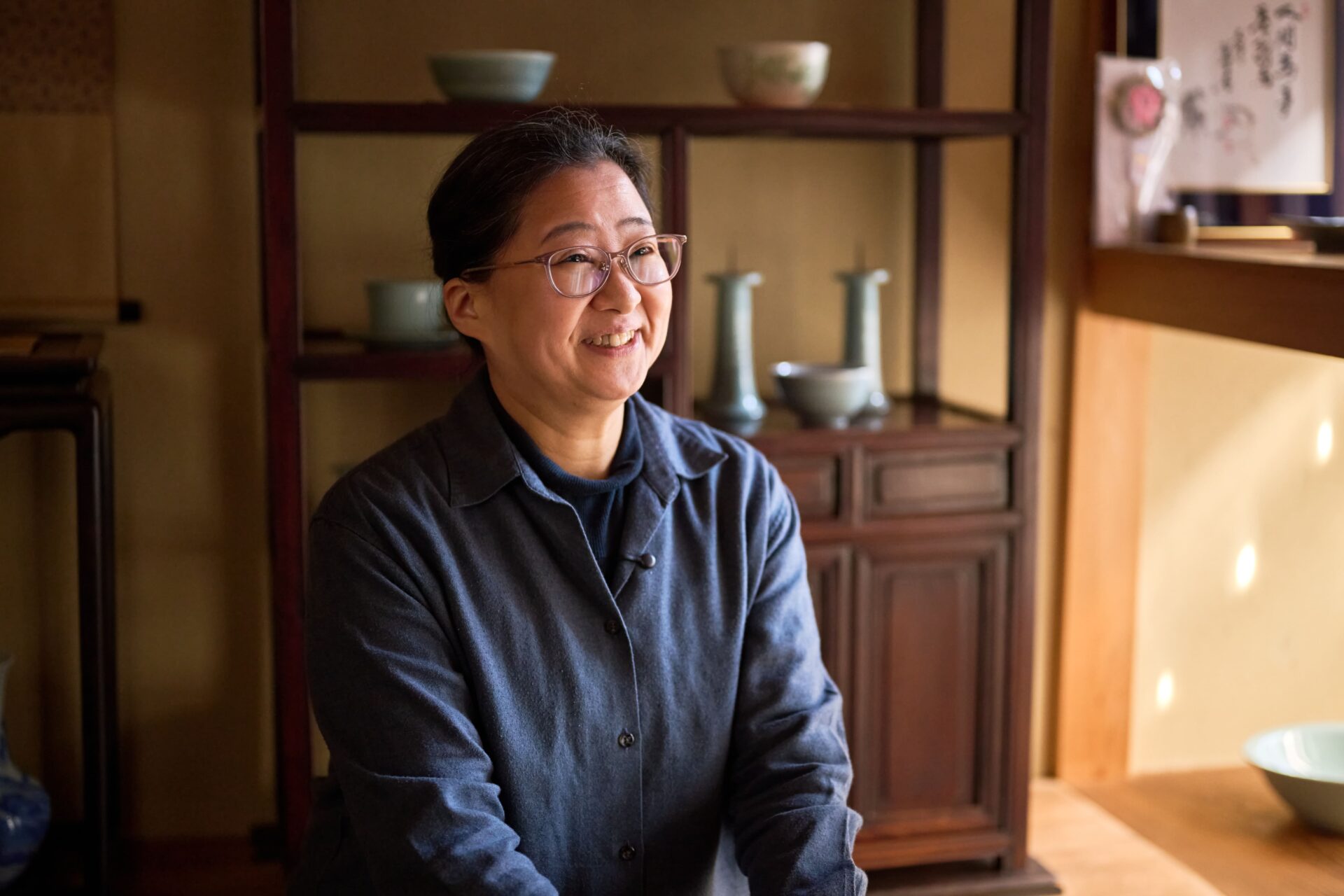 京都・五条坂。清水焼の歴史が重なるこの地で、黄味がかった磁土が轆轤の上に立ち上がる。まるで生きているかのように、指先の圧がわずかに変わるだけで、口縁の厚みが変わる。青磁は偶然に委ねる焼き物ではない。設計し、管理し、火と向き合い、色を「作る」焼き物である。その設計の側に立つのが、四代諏訪蘇山である。 四代は千家十職の塗師・中村宗哲家の三女として育った。母は十二代宗哲、父は三代諏訪蘇山。家には常に茶道具があり、歴代の品が鑑定に戻ることもあった。どこで使われ、誰の手を経たかが語られ、季節によって茶碗を替えて抹茶を点てる時間が日常にあった。