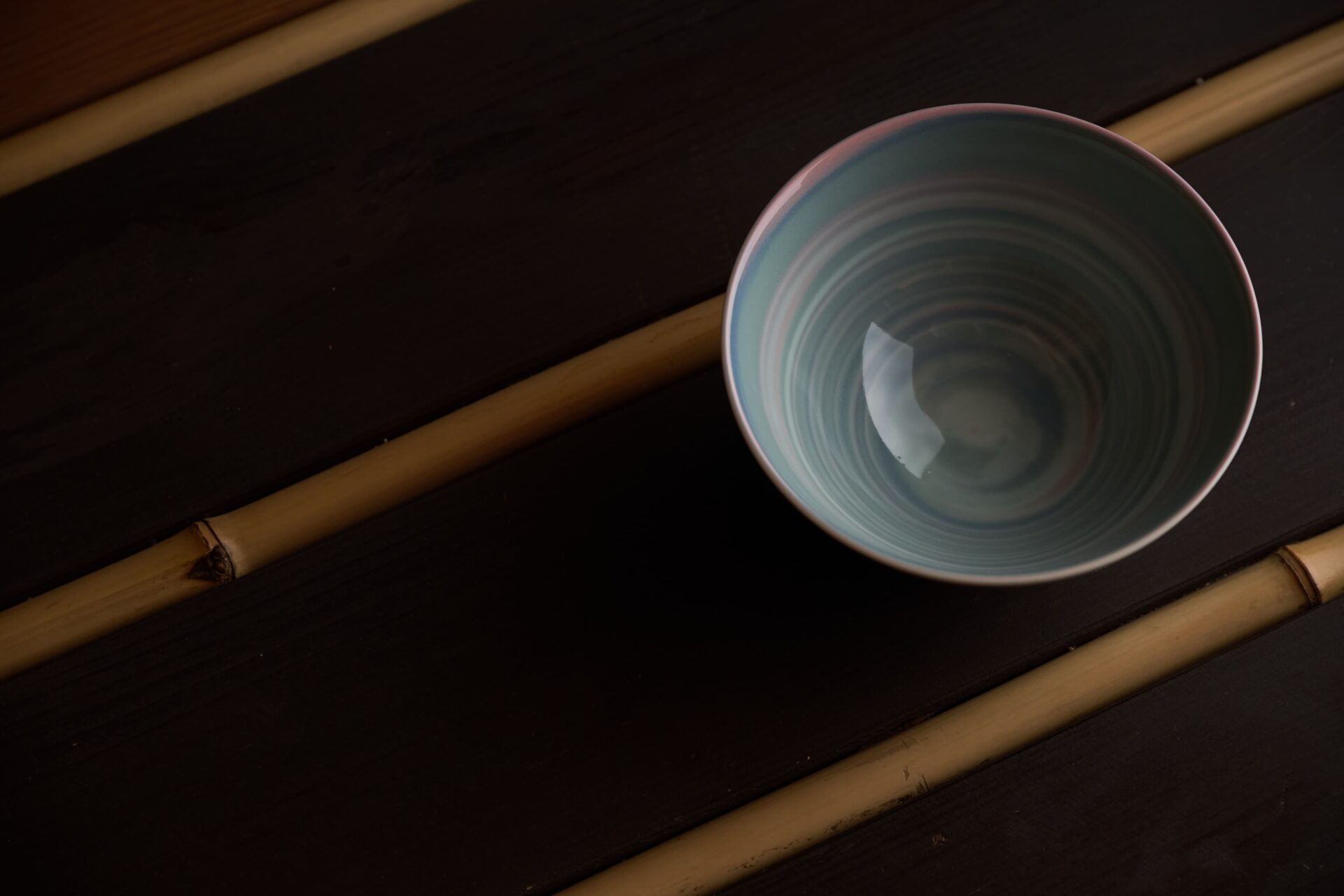 「抹茶茶碗にピンク色ってどうなんかな、と思っていましたけど、想像以上に人気があって」さらに『枕草子』を題材にしたシリーズでは、《春はあけぼの》の色味を表現した。白・青・藍・薄紅・黄の胎土を重ね、夜明け前の空が次第に白んでいく気配を表現する。練り込みは装飾ではない。青磁の胎土設計を理解しているからこそ可能な拡張である。青磁を焼く家として、青磁の可能性をどこまで広げられるか。それは更新であり逸脱ではない。