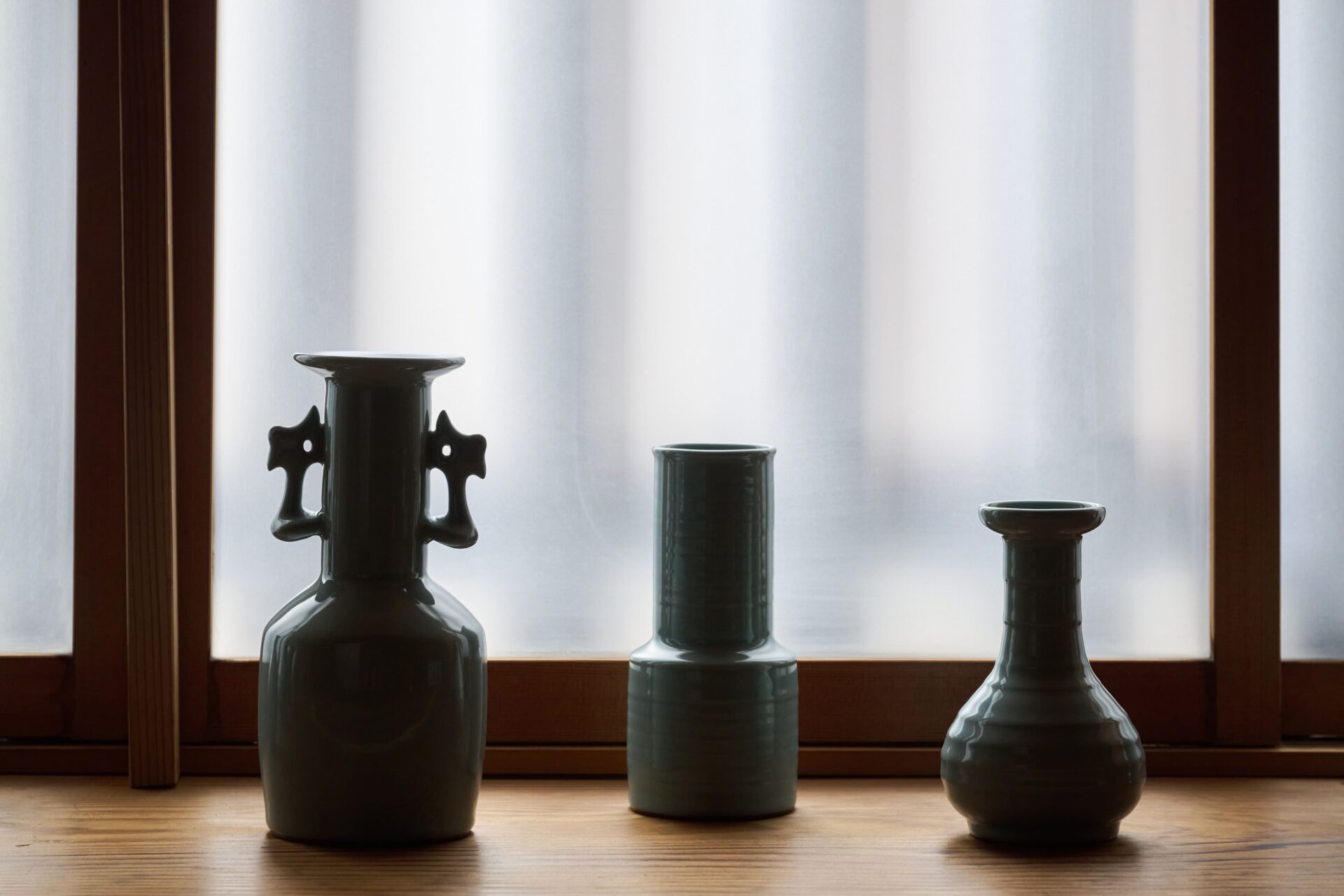 還元という焼成方法で酸素を奪い、鉄を青く発色させる。その条件を整えるために、胎土や釉の調合を変え、窯と相談しながら何度も焼いた。「蘇山の青」になるまで二十年。「青磁を焼けば家が潰れる」と言われた時代、設計を繰り返し試行錯誤を積み重ねた。初代は青磁を完成させたあとも新たな作品へ向けての研究を続けていたという。青磁は到達点であると同時に出発点でもあったのだろう。