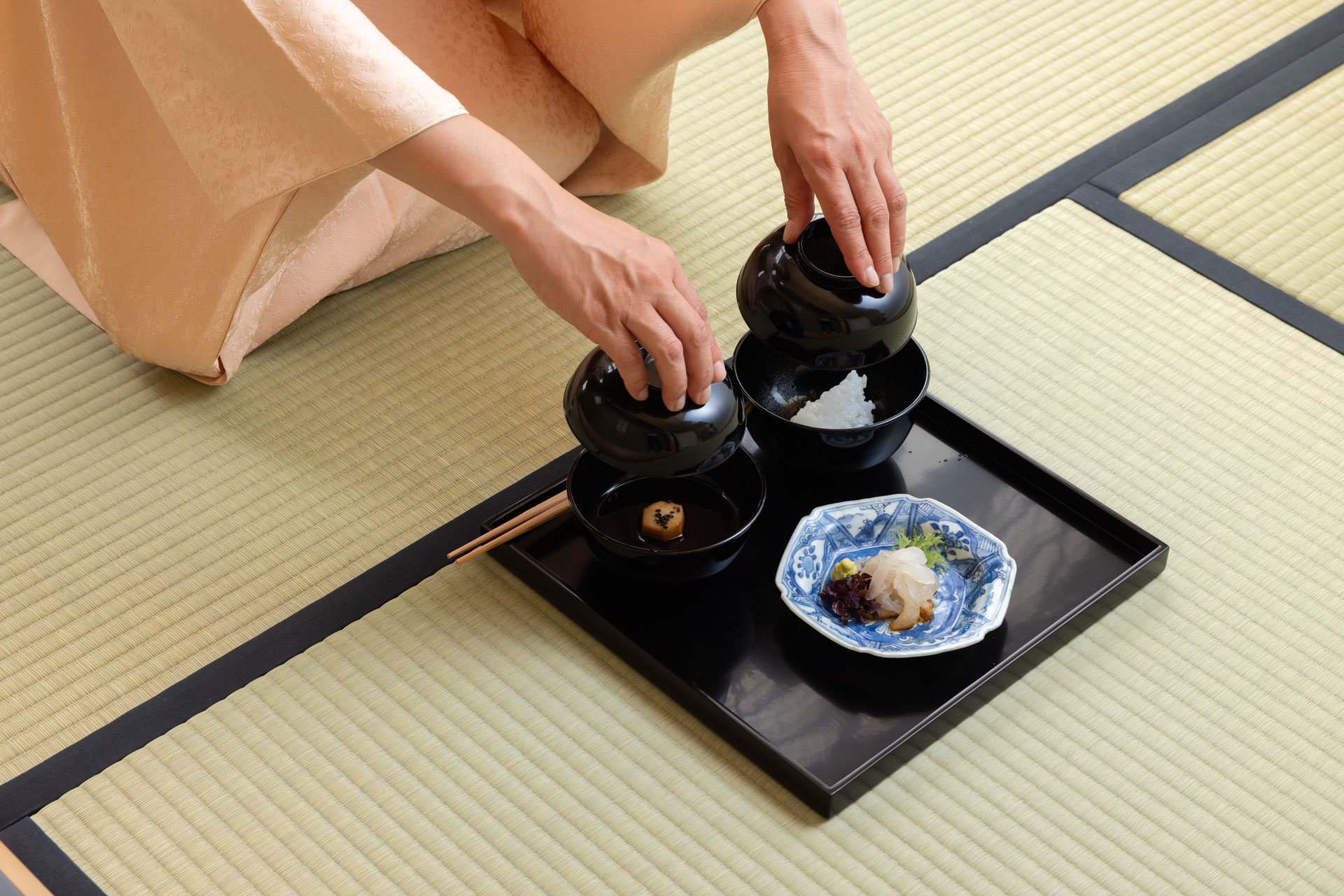 懐石料理の折敷に置かれた、飯椀・汁椀の蓋を取り上げる場面