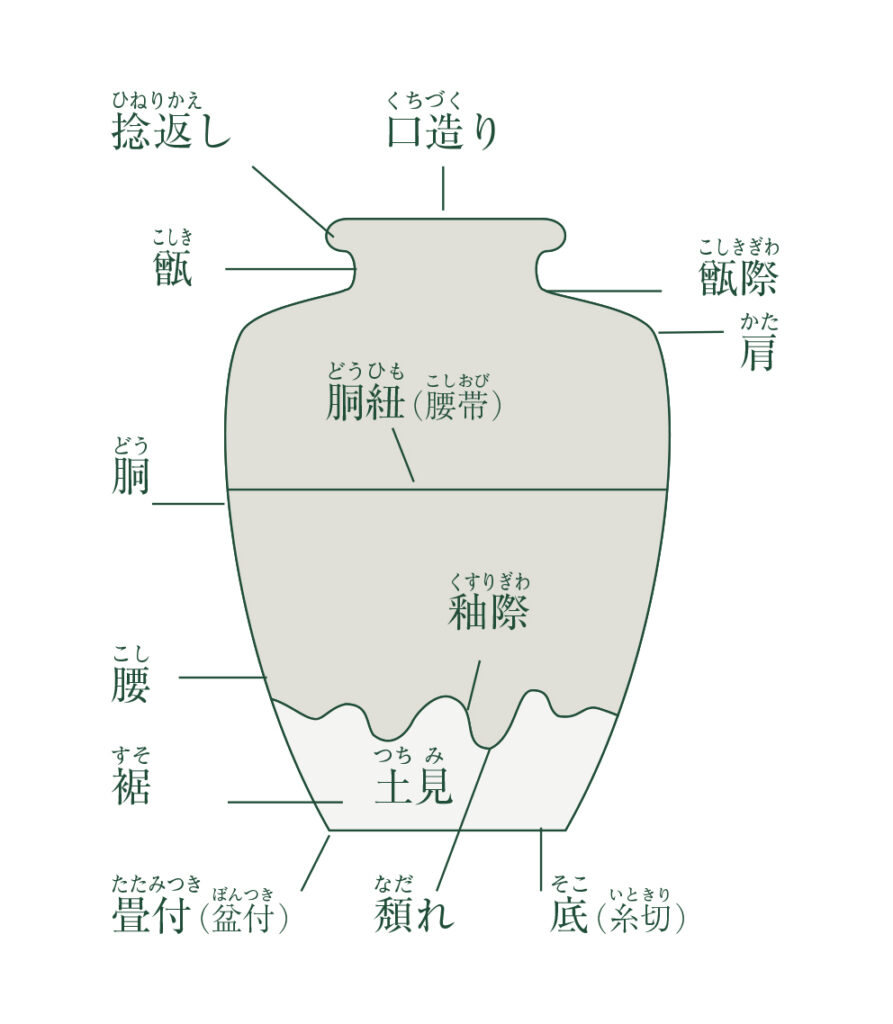 肩(かた) 甑の下から張り出す部分。茶入の印象を大きく決める場所です。