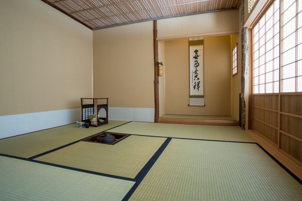 茶の湯は、こうした既存の座敷空間を背景に発展しました。独立した特殊な空間として成立したのではなく、当時の住空間の延長の中で工夫が重ねられたわけです。そのため、共有されていた寸法感覚の中で四畳半が基準として受け継がれました。四畳半は茶の湯独自の発明ではなく、建築文化と連動した広さといえます。