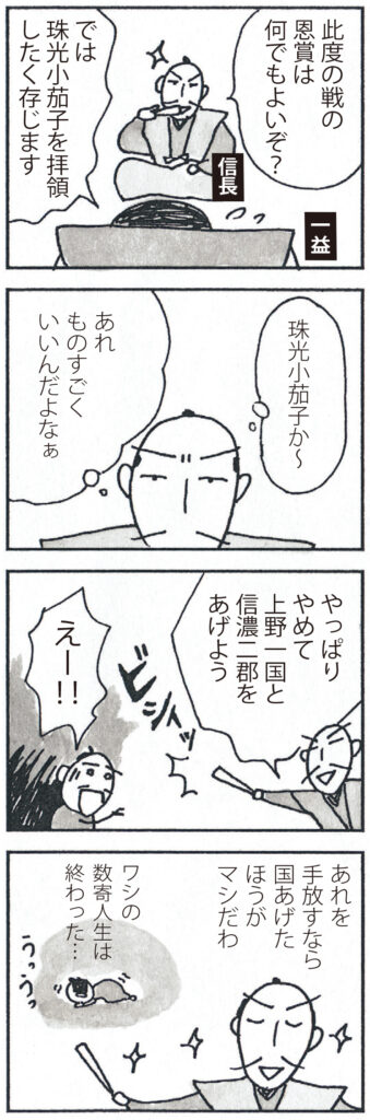 天正十年(1582)、武田氏滅亡後、信長は関東支配を滝川一益に命じ、上野一国(厩橋城)を与えました。このとき一益は、知行ではなく名物茶入「珠光小茄子」を望んだと伝えられます。