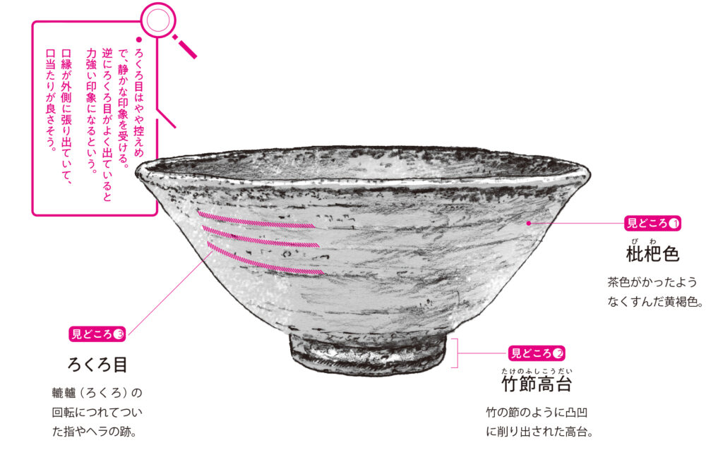 先生 見込みの深さのほかに、井戸茶碗には枇杷(びわ)色である、ろくろ目がある、竹節高台(たけのふしこうだい)、兜巾(ときん)がある、梅花皮(かいらぎ)が出ているという特徴があります。