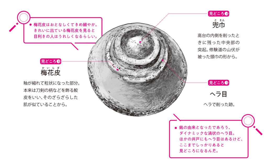 先生 約束事というより、あくまでも見どころですね。この小井戸は、梅花皮はおとなしいけど、竹節高台や渦状のヘラ目が特徴的。井戸はその大きさから大井戸や小井戸、色味から青井戸という分類はあるものの、一つとして同じ作行(さくゆ)き(出来栄え)のものはないんです。