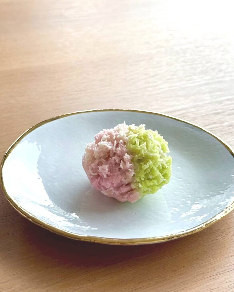 淡い二色のきんとんが織りなす彩りは、まるで春の霞に包まれた山々や、光に透ける花びらの重なりのよう。