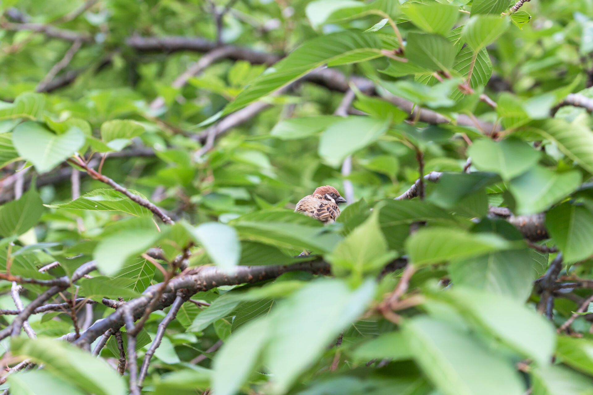 それまで開けて見えていた枝先も、やわらかな新緑に覆われていきます。雀の気配はあるものの、姿ははっきりとは見えず、葉の揺れや小さな音によって、その存在が感じられます。