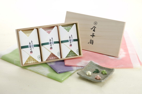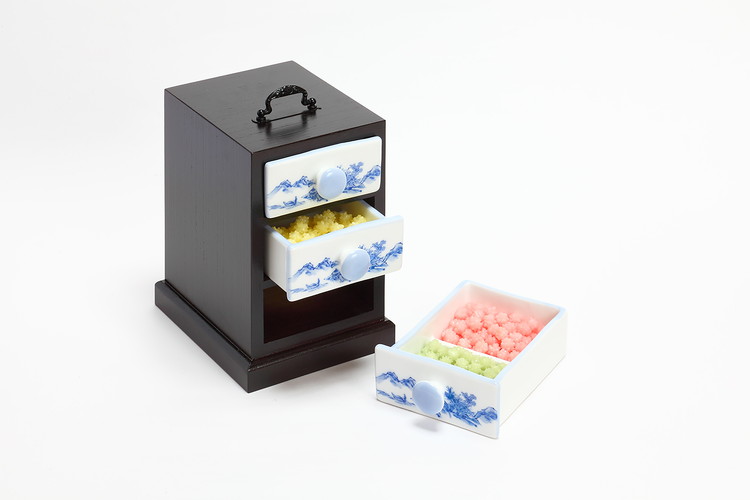「究極の金平糖」「特撰玉あられの金平糖」など、こだわり抜いた素材と職人の巧みな技により生みだされるシリーズより、季節に応じて厳選した六種類の金平糖が陶器の引き出し三段に収められています。趣向を凝らした風雅な器が最高品質の金平糖をより一層引きたてる逸品。