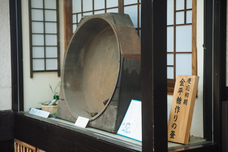 本店店頭に飾られている慶応初期の釜。当時は練炭や薪で火を起こし、手作業でひたすらかき混ぜ、1種類に約2ヶ月かけて作られたといわれています。現存するものはほとんどなく、京都文化博物館にて展示されたこともあるそう。