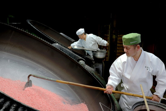 金平糖は天文15年(1546)にポルトガルからもたらされた南蛮菓子で、当時の日本は砂糖が大変貴重とされ、形の不思議さからも非常に珍しがられ、千利休も茶菓子として用いました。緑寿庵清水は弘化4年(1847)の創業で、味のバリエーションが豊富で彩りも美しく、今も茶人にとっては欠かせない存在です。昔と変わらない手法は一子相伝。緑寿庵清水の金平糖は、イラ粉と呼ばれる0.5mmほどの小さな核に蜜掛けをし、コテを入れてほぐす作業を繰り返し、1種類2週間以上をかけて作られています。毎日の気候や湿度により変動する、金平糖の結晶具合を五感を使って見極め、蜜の濃度や釜の傾斜、回転速度、角度、温度、この全てをその時々によって調節しなければならず、技術の体得には20年以上かかるといわれます。熟練の職人が丹精込めて手づくりし、伝統と独自の製法を守り続けてきた日本唯一の金平糖専門店です。