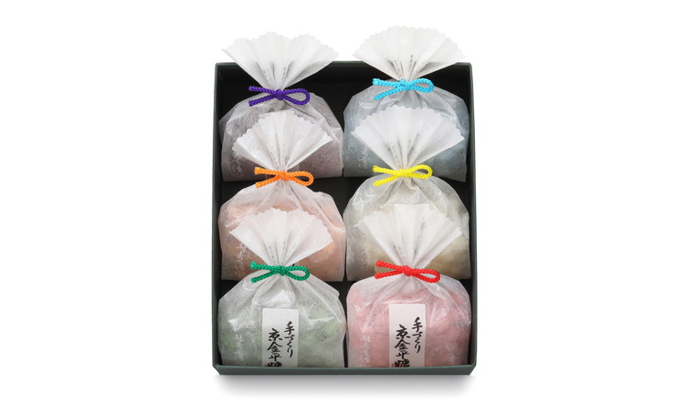 小袋に入った定番の金平糖の詰合せは、老若男女、年齢をとわず手土産に喜ばれています。それぞれの果物をつぶし、ふんだんに使用して作られるため、素材の瑞々しさが口いっぱいに広がります。 「六種詰合せ」では、果物の味を中心に、彩りも美しい人気の六種の金平糖を楽しめます。