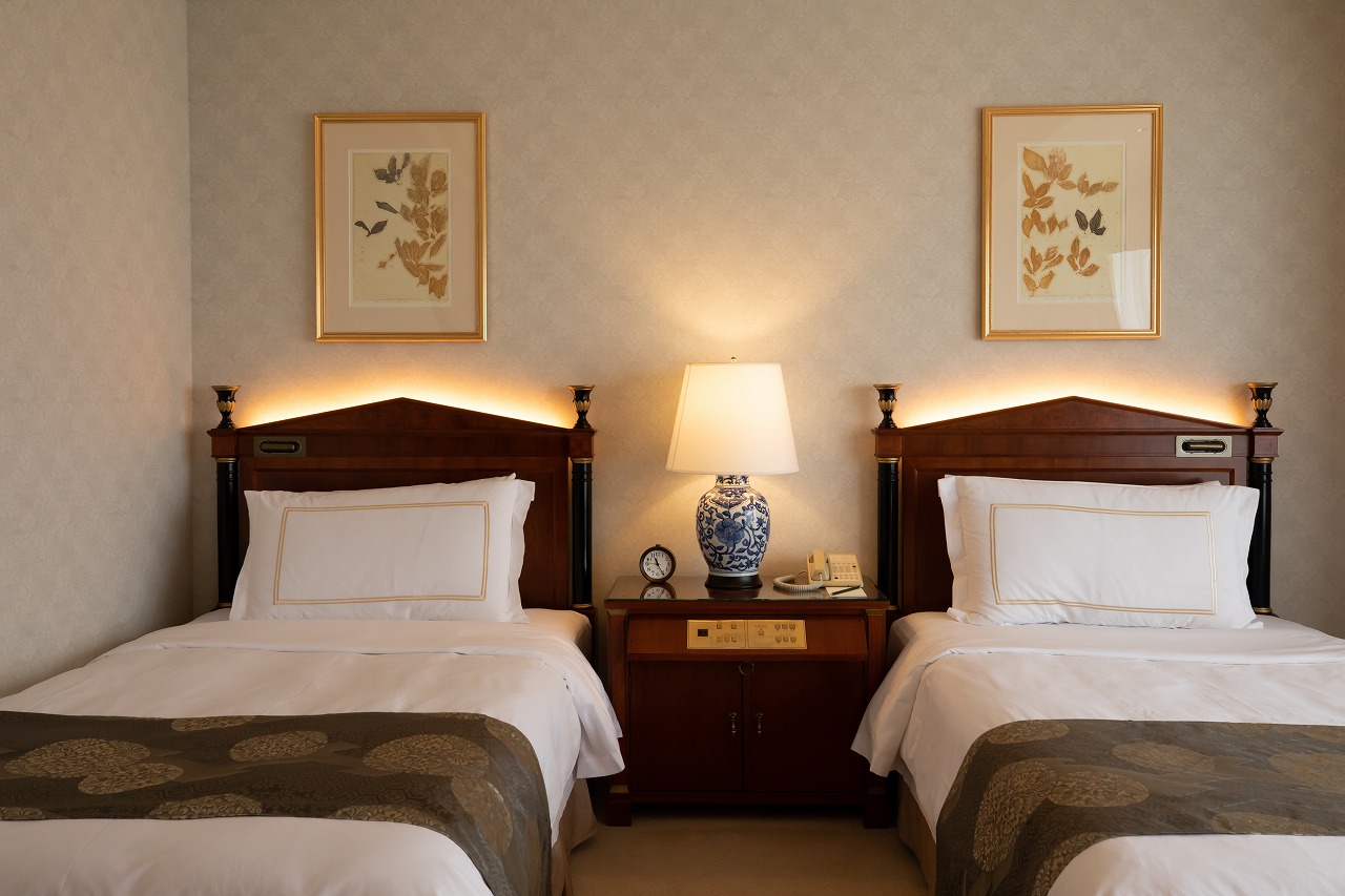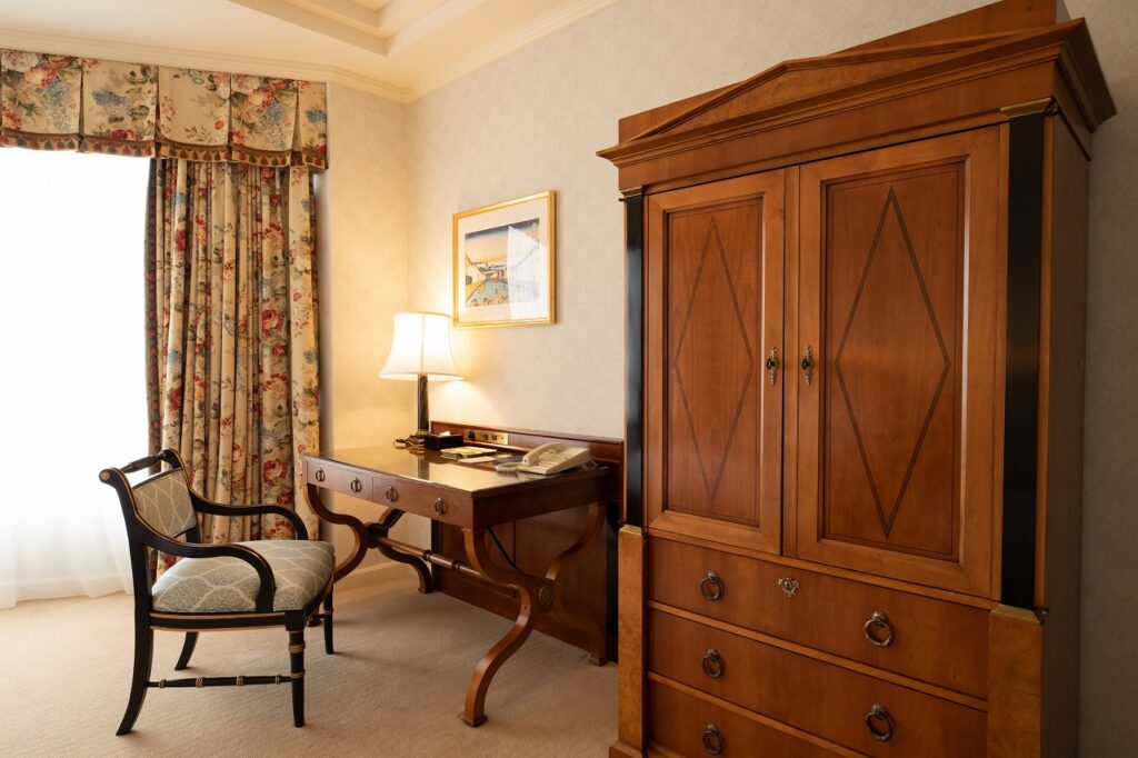 客室のデザインは「プライムクラシック」と「プライムモダン」があります。「プライムクラシック」のツイン。優雅な曲線を描くライティングデスク、テレビを収納するアーモアなど、開業時からリペアしながら大切に受け継いできた家具が置かれています。