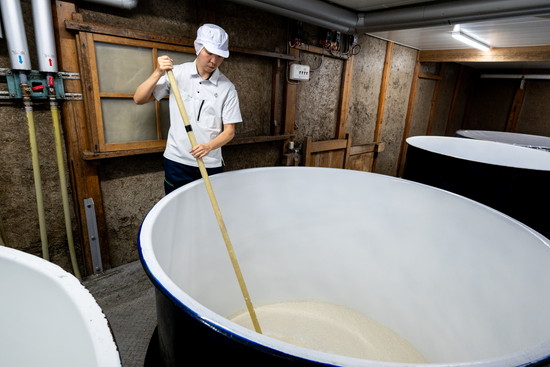 酒造りの工程の一つ、「醪(もろみ)の櫂(かい)入れ」の作業の様子。米と麹が沈殿するのを防ぐため、朝と夕方の決まった時間に櫂棒を使って数回だけ撹拌します。高さ約1・8㍍のタンクの中をのぞき込むように職人がそろりそろりと混ぜ合わせますが、混ぜすぎてお米が溶けてしまうと雑味が出てしまうため、丁寧さが求められるデリケートな作業です。タンクの中では、いくつもの気泡が浮かび上がっては消えていきます。醪が元気だと耳をすませば「ピチピチ」という音が聞こえてきます。