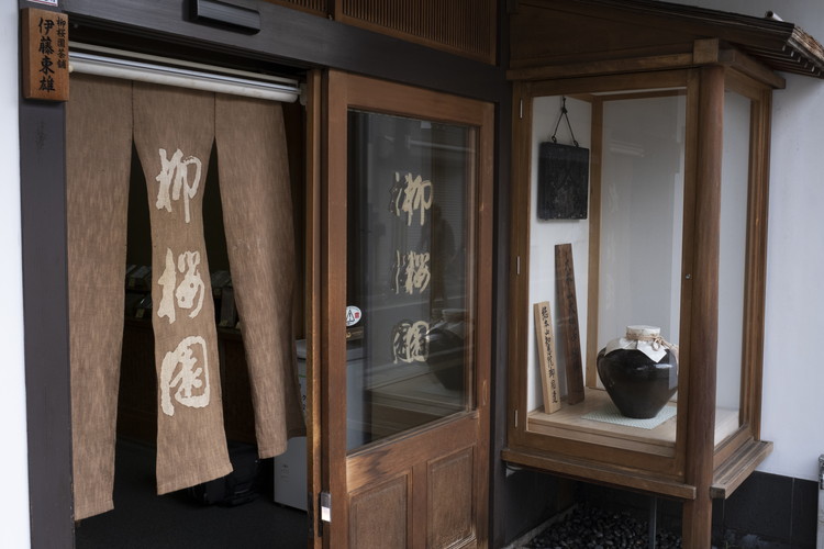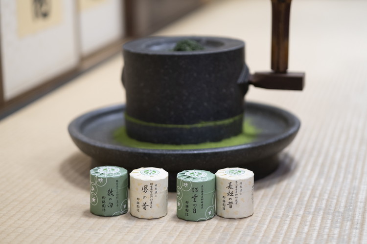 御所南の街中、店頭にお茶の香りがここちよく漂い、道行く人を和ませる老舗茶舗。裏千家をはじめ三千家御家元の御好が揃う柳櫻園の歴史は江戸末期まで遡ります。初代の伊藤勝治は伊勢・桑名の名士で、十代以上続く臼屋の生まれ。地域柄薬効を持つ食材が身近にあり、家業がそれを挽く臼屋であったことから医学や薬学を修めようと、当時評判の高い御典医であった浦野家の書生となります。幕末の動乱で浦野家が失職し、医の道が閉ざされてしまいますが、「茶も薬」として茶業の道へと進みます。そして明治8年に間之町(あいのまち)に開業したのが柳櫻園です。その後、二代目治三郎、三代目東雄(はるお)が茶園や設備を整え、より繊細に茶の湯に適した抹茶を作れるように発展させました。抹茶は宇治川河川敷の提携茶園で栽培育成した厳選茶葉を使用し、挽き立てが身上。今も出荷直前に挽き上げて手詰めしています。