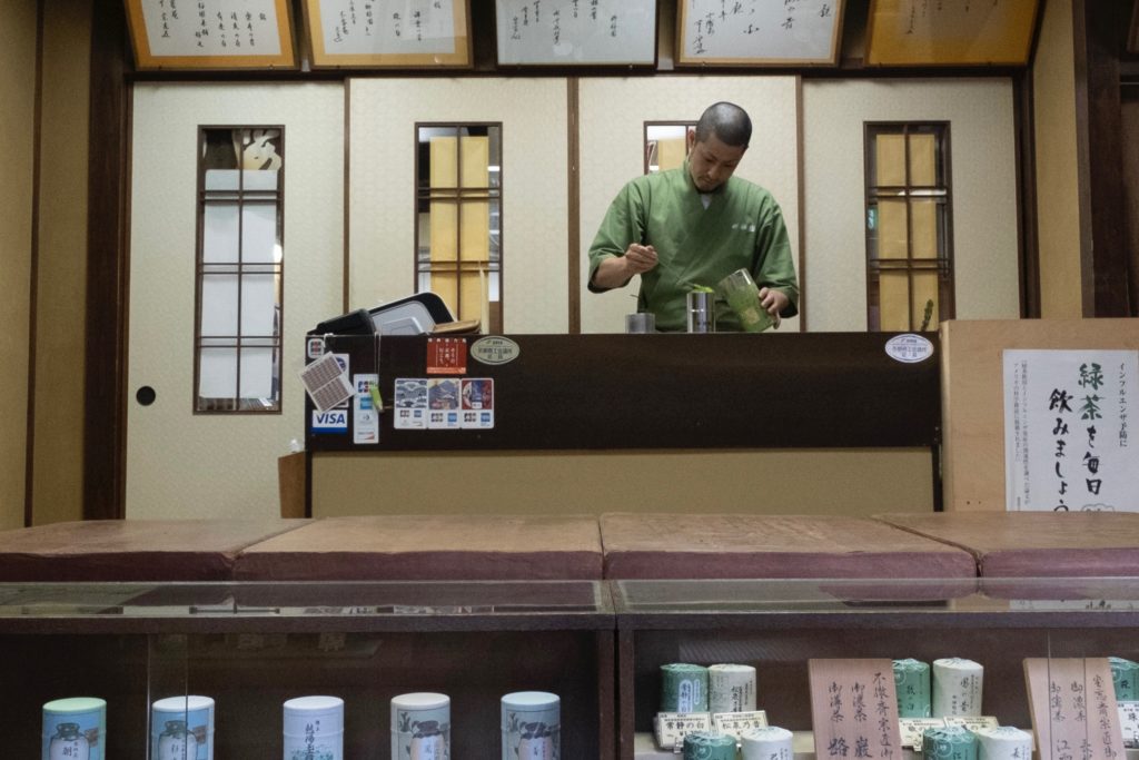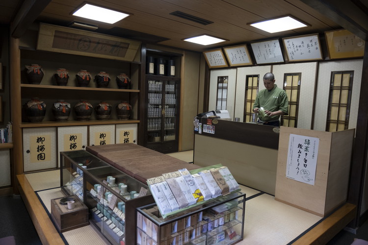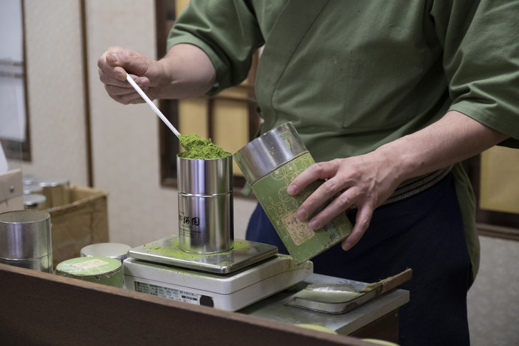 柳櫻園茶舗の店頭では、新鮮な挽き立ての抹茶の香りが香る。