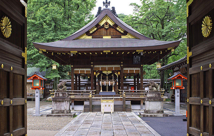 平安京の建都に貢献された奈良時代の官人・和気清麻呂(わけのきよまろ)公をお祀りしています。もとは洛西の高雄山神護寺の境内に清麻呂公の霊社として祀られていましたが、明治19年(1866)、明治天皇の勅命により京都御所蛤御門(はまぐりごもん)前の現在地に社殿を造営、神護寺境内からご遷座。後に姉君の和気広虫姫も主祭神として合わせ祀られました。数ある御神徳のなかでも、厚く信仰を集めるのが「足腰の健康・病気怪我回復」。これは、清麻呂公が足を傷つけられ立つこともできなかった時に、現れた300頭のいのししによって難を救われ、足も回復したという由緒にちなむものです。同時に、このいのししとの深いご縁から、亥年生まれの方には特にご利益があると崇敬されています。亥年生まれの裏千家鵬雲斎大宗匠が折にふれお参りされることも、茶人には思い入れの深まるエピソード。境内には見どころも多く、ゆっくりと訪れたい神社です。