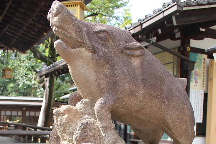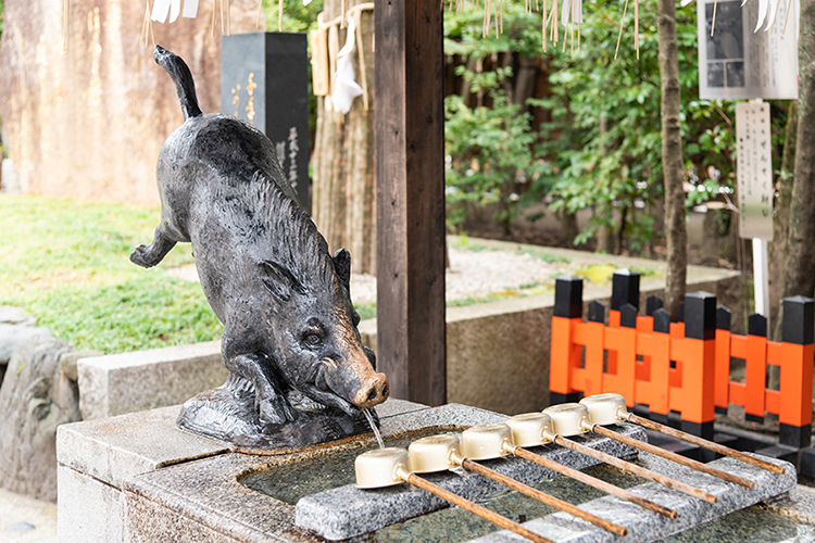 境内に入ってすぐ右側には「霊豬手水舎」が。水の出ているブロンズの猪像は、「鼻をなでると幸せが訪れる」と参拝者に親しまれています。