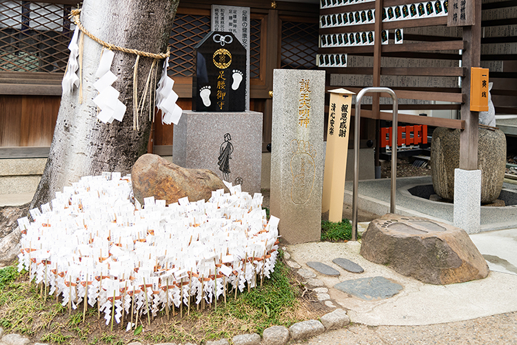 足腰の病気やけがの回復を祈願する方は「足萎難儀回復の碑」へお参りを。足形の石の上に乗ったり、碑をさすったりして祈願します。毎月21日には、足腰の健康を祈願する「足腰祭」が斎行されています。 そのそば、本殿に向かって右側にそびえるのが招魂樹(おがたまのき)。根元には「願かけ猪」の石像があり、周りには「座立亥串」(くらたていぐし)という護王神社独自の願掛けの串がたくさん刺し立ててあります。