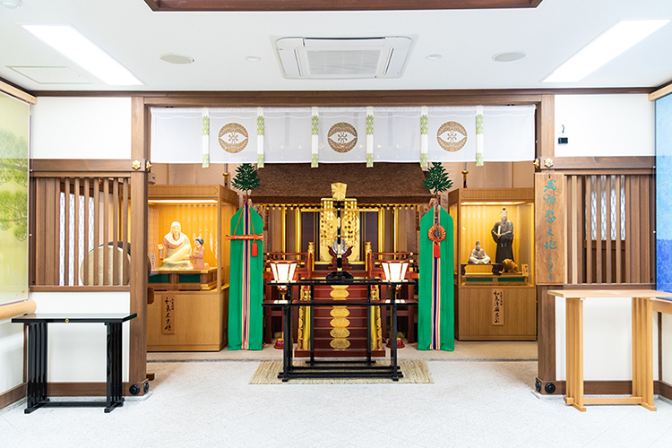足腰の病気怪我平癒をはじめ、さまざまな願意への祈祷に使用される祈願殿。両側には二柱の御祭神、護王大明神の和気清麻呂公、その姉君であり博愛慈悲の神様、子どもの守り神として崇敬される和気広虫姫の像がやさしく見守ります。