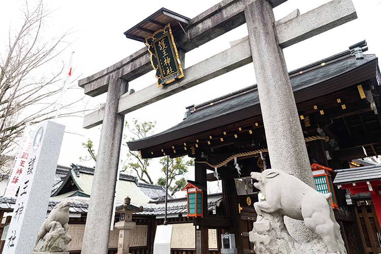 京都御所の蛤御門前、烏丸通に面して堂々とした構えを見せる鳥居と護王神社のシンボル狛いのしし。鳥居奥の表門は、大正天皇即位の御大礼に使用された大嘗宮春興殿正門の御下賜を受けたもの。この門をくぐってお参りをされるすべての方に御利益がありますようにとの願いを託して大きな「足腰御守」が掲げられています。