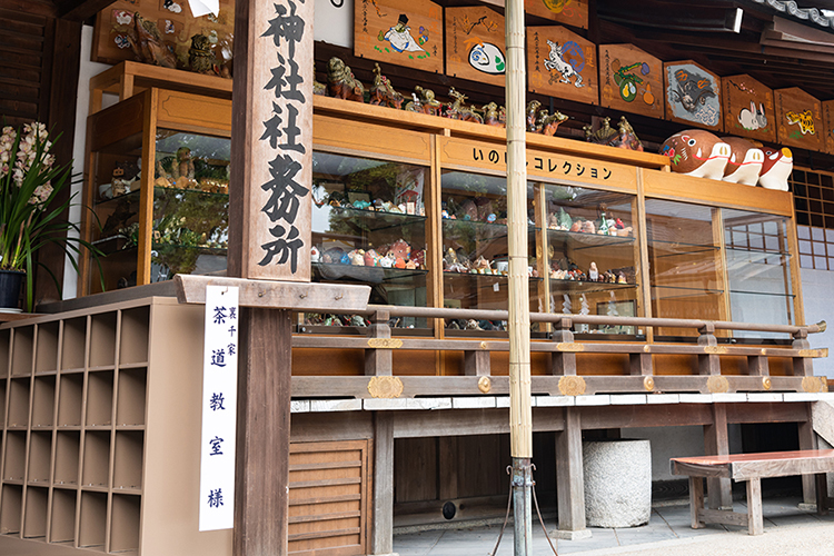 社務所には茶室を備え、裏千家茶道教室のお稽古場としても使用されています。表に設置されたケースに居並ぶのは、全国から奉納された「いのししコレクション」。