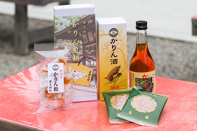 境内にはカリンの大木がそびえ、その実の効能から、ぜん息封じのご神木とされています。毎年、大量に収穫される実でつくられたカリン酒やせんべい、飴を護王神社の授与品として社頭授与所でのみお頒ちされています。