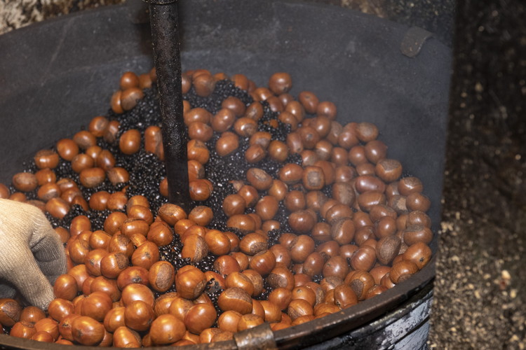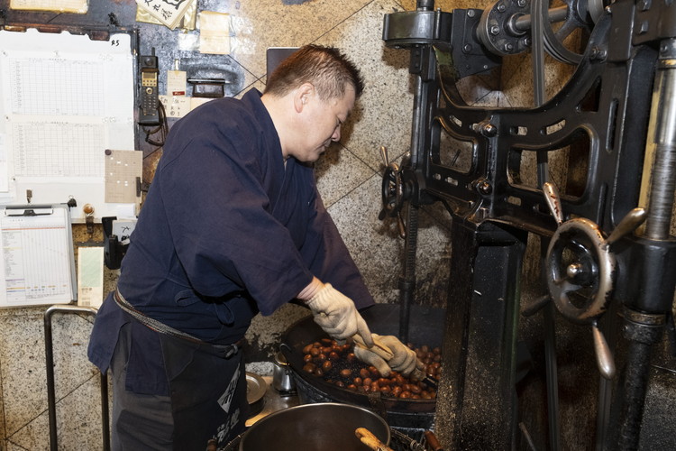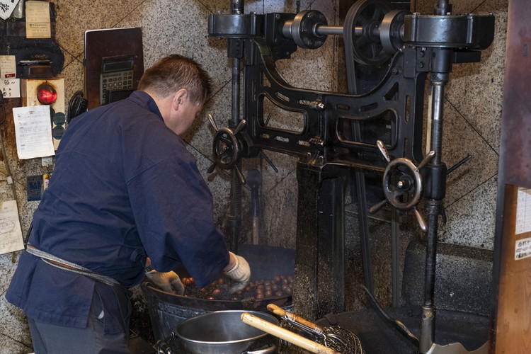 栗は50分かけて焙煎してます。栗本来の豊かな甘みや芳ばしさを引き出すために、焼き加減やタイミングなど、熟練の技で見極めています。