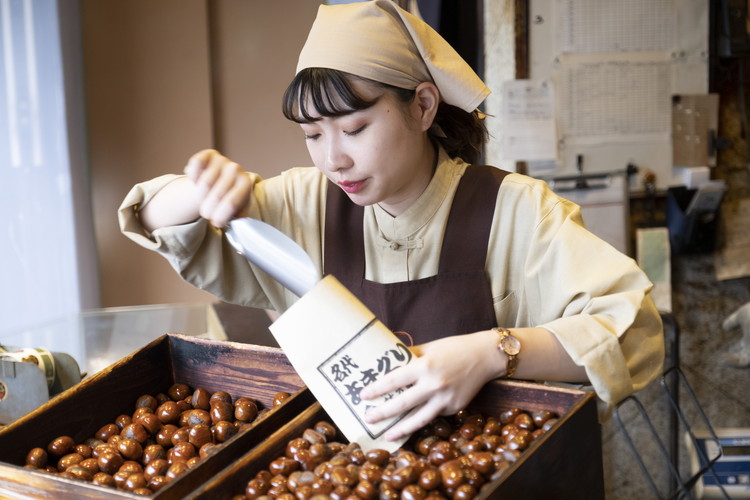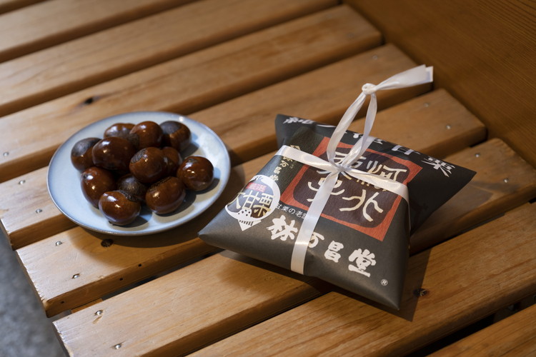 店の前を通りかかると、芳ばしい香りがふと鼻先を漂います。林万昌堂は明治7年に「くわいや武兵衛」の屋号で創業以来、甘栗一筋の専門店。四条通に面し、新京極通と寺町通の間という昔から賑わいのある場所で、多くの人々に愛されてきました。店頭で芳ばしく焼き上げられている栗は中国河北省産のみを使用。糖度が高く、ミネラル・鉄分が豊富な果肉で、渋皮が外側の固い殻とともに剥きやすいのが特徴です。店主の林雅彦さん自らが探し出し、今も現地に出向いて味を確かめて仕入れているといいます。多いときには1日に300kgほども焼いているそうで、少ない時期でも約100kg。「焼きたては身がサクッとしていて、時間が経って冷めてくると身が締まって甘みが強くなる」と林さん。中には、あえて1日置いて食べるというこだわりを持つ常連さんもいるそうです。