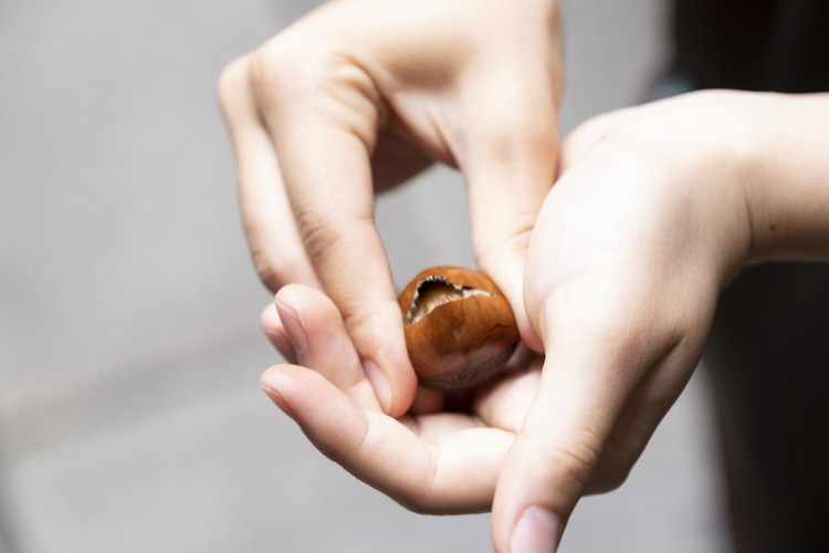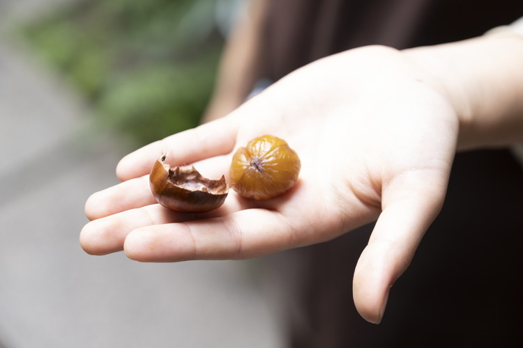 難しそうで、実は簡単割れるのが林万昌堂の栗。まず栗のふくらんだ面に、爪で横一列に割れ目をいれます。次に、キズの両端を持って内側に押します。すると、割れ目が開いて固い皮が渋皮と共にきれいに割れて、中身が取り出せます。