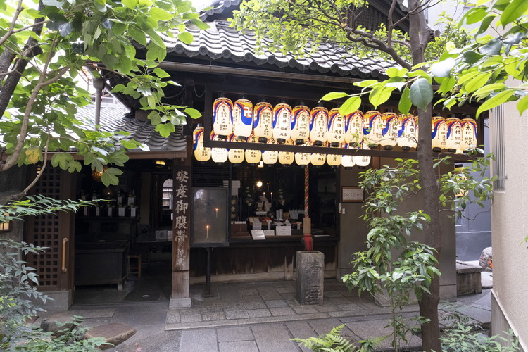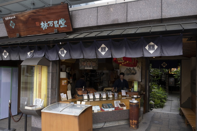 店の奥に見えるのは、808年、弘法大師・空海により創建された染殿地蔵院。弘法大師作と伝わる高さ2mの地蔵菩薩をお祀りしています(秘仏)。平安時代から安産守護・子宝祈願の信仰を集め、文徳天皇皇后・藤原明子(染殿后)が願を掛けて無事に皇子(後の清和天皇)を生んだことから、染殿地蔵尊と呼ばれ、清和天皇御生誕地とも。新京極通からもお参りできますが、林万昌堂を通ってお参りすることもできます。