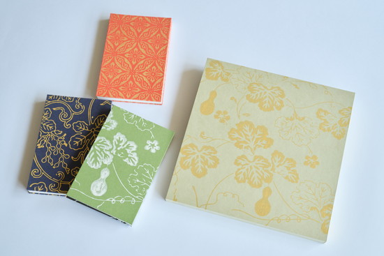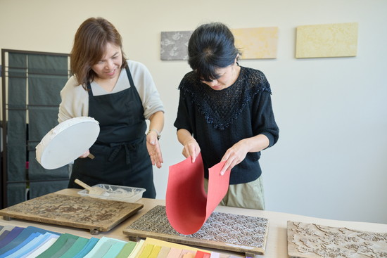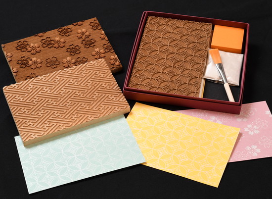 初めての方でも京からかみを気軽に体験することができます。用意された「ハガキ摺り」「唐紙摺り」「御朱印帳作り」「パネル作り」の4つのコースからご希望に応じて選べます。