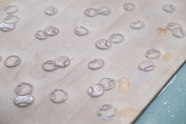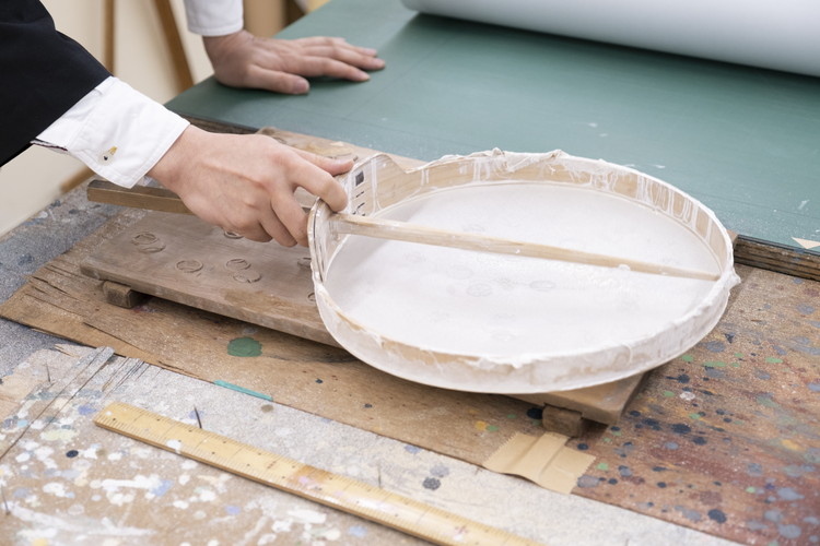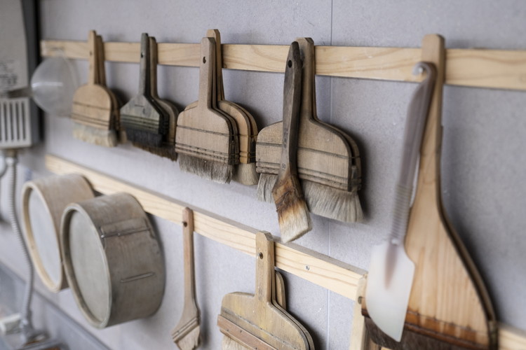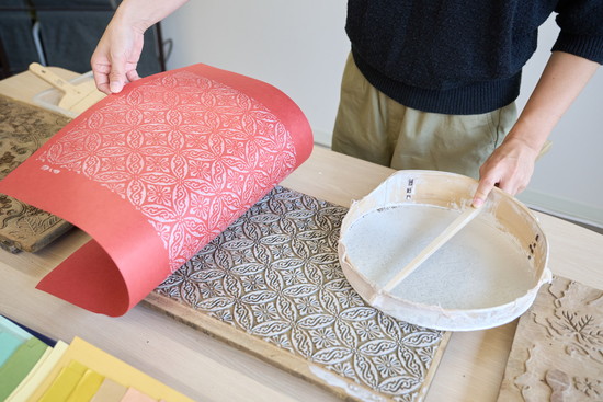 専属の摺り師・工藤祐史さんによる手摺りの現場を見せていただきました。丸い木枠にガーゼを張った独特の道具「ふるい」を使って絵具を版木にのせていき、上から紙をそっと置いて手のひらでやさしく摺り、文様をうつしとります。湿度によっても微妙な調整が必要とのことで、勘と経験がものをいう繊細な作業です。