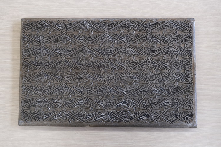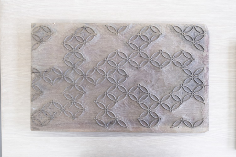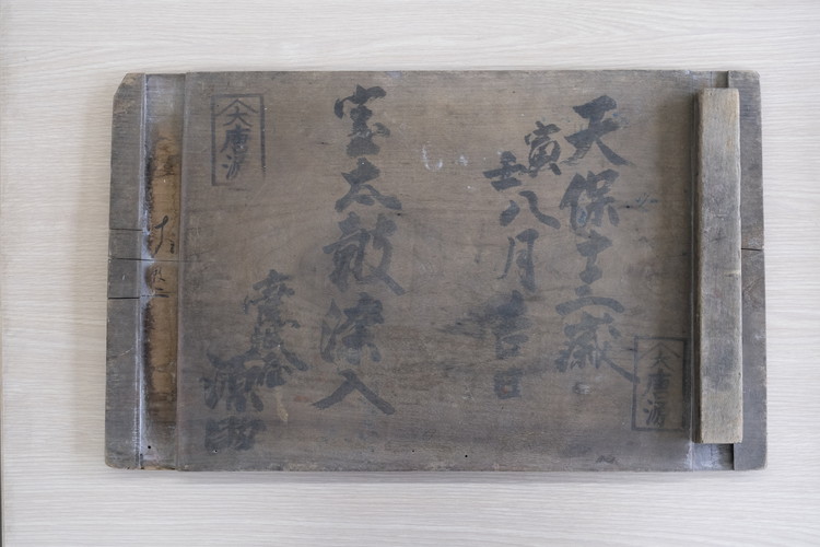 丸二が現在所有する版木は約300枚あまり。それらを使った唐紙の製作から工事施工まで、一貫オーダーができます。また、唐紙のみの購入も可能です。受け継がれた版木のひとつ「破れ七宝」。裏面には天保12年という製作年が墨書きされており、歴史を伝えます。