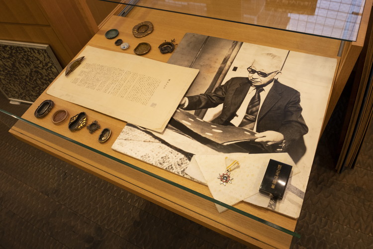 表具師・西村高緑堂として創業した丸二。昭和21年、当代西村和紀さんの祖父・正雄さんが襖建具・表具(屏風,掛軸,額装等)・インテリア材料卸業に事業転換し、今に至ります。正雄さんはその伝統工芸品伝承への功績で、勲五等瑞宝章受章の栄誉も。