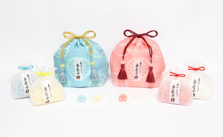 世界的ファッションデザイナー・丸山敬太氏とのご縁から実現した「祇園限定 信玄袋」。「瓶覗(かめのぞき)」(檸檬の金平糖・天然水サイダーの金平糖)、「桃花色(ももはないろ)」(苺の金平糖・林檎の金平糖)の二種類。緑寿庵清水の社紋がデザインされた信玄袋に金平糖に似たビーズが付き、目と口で愉しんでいただけます。各 3,080 円(税込)