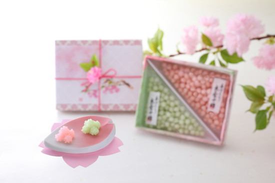 塩漬けした桜の花びらを蜜がけし、軸を煮立てて香りと色を取った「桜の金平糖」と「緑衣黄(りょいこう)桜の金平糖」。ひと粒噛むと口いっぱいに桜のお味が広がり、春の風情を感じる人気のお品です。