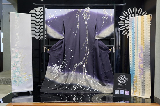 会社のエントランスには「京の名工」である岡山武子さん作の着物が飾られています。中央は、京都の八坂神社の夜桜と天の川を描いた作品。左は、菊と四季草花が描かれている胸通しの附下で、右の反物は素描きと濡れ描きを併用した作品です。ともに豊かな色彩の中に繊細な手描き友禅が施されています。