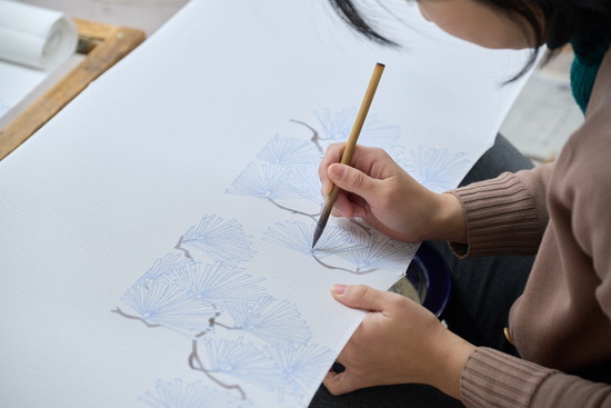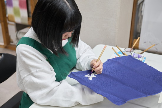 生地を伸子に張ってもらったら、いざ、染めのスタートです。作業の目安は30分ほど。職人さんに質問すればアドバイスがもらえますが、基本は自由制作してもらいます。「機械で作ったきれいではなく、はみ出たり、ゆがんでしまったり、そんなことも含めた手作りの良さを感じて、面白いと思っていただければ」と摩紀さん。