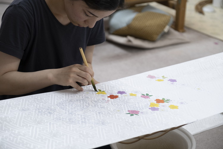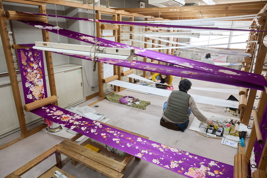 社内外、合わせて100人近くの職人を抱える岡山工芸。全く経験の無い人も雇い入れ、手描き友禅の職人として一人前になるまで育て上げることも使命としています。