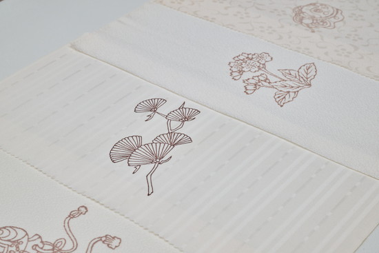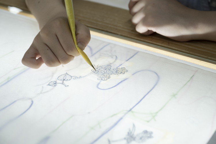 制作工程の一つ「糊置(のりおき)」。丹後や長浜の白生地に、糸目糊をおいていきます。図案は、新作はもちろん、創業以来培ってきた18000柄。実に種類豊富です。