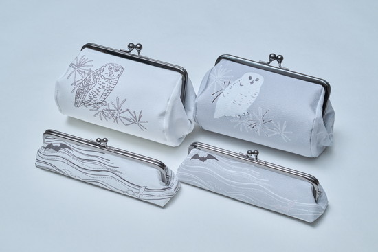 帯の図案を元に商品化したONE TONEシリーズの金封袱紗(左)と念珠入れ(右)。白地に黒、グレー地に白や黒の線描で表現したモダンな表情の手描き友禅です。一つ一つ手編みされた組紐は6色から選べます。