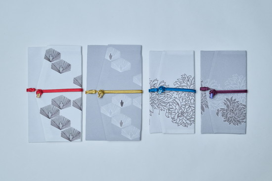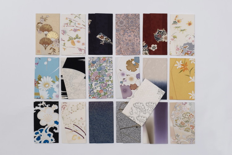 色とりどりの金封袱紗。着物や帯地の端切れ、見本裂などを使って作られています。同じ柄でも一つとして全く同じではない、手描きならではの風合いが楽しめます。