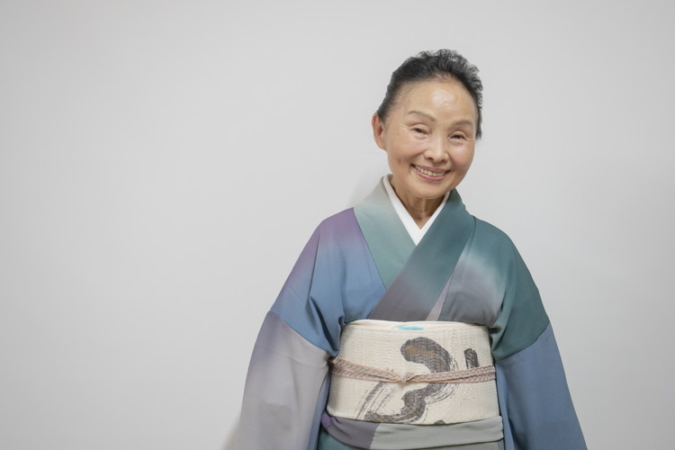 自身が手がけた着物と帯を身にまとう岡山武子さん。「人が持っていないもの、私が着たいと思うものを作っています。この着物1枚に60色ほど使っているんですよ」と語り、色違いでシリーズ化しているトレードマークのような着物なのだとか。着物を作ることが楽しくて、ずっと続けてきた武子さんが「好き」を突き詰めた結果だと言います。