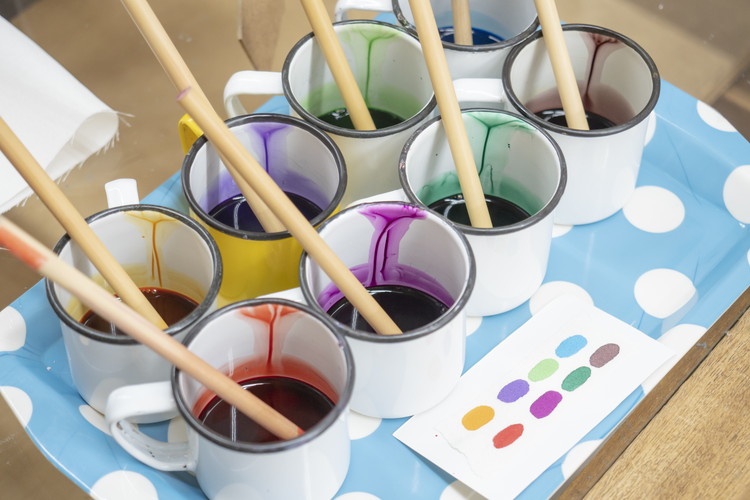 染料8色と色見本。容器の中の染料は黒っぽく見えて色が分かりにくいので、色見本を参考にしながら、1色ごとに筆を変えて染めていくのが友禅染の特徴です。