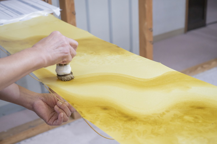 友禅工程のなかで最も華やかな工程「彩色(さいしき・挿し友禅)」。糊置で囲んだ模様の内側に染料を挿していきます。